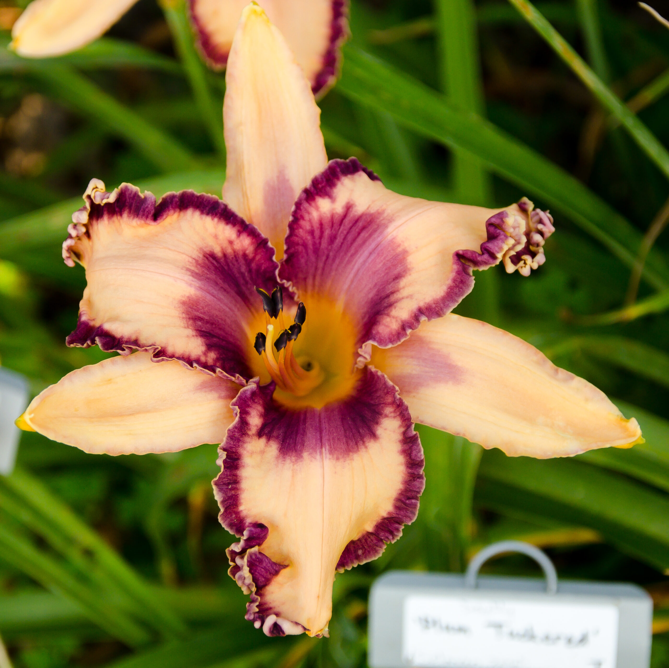 Peach with chevron-shaped plum eye, yellow to green throat and wide plum edge outlined with gold. Height 36″ Bloom 6″ (Selman, 2010)